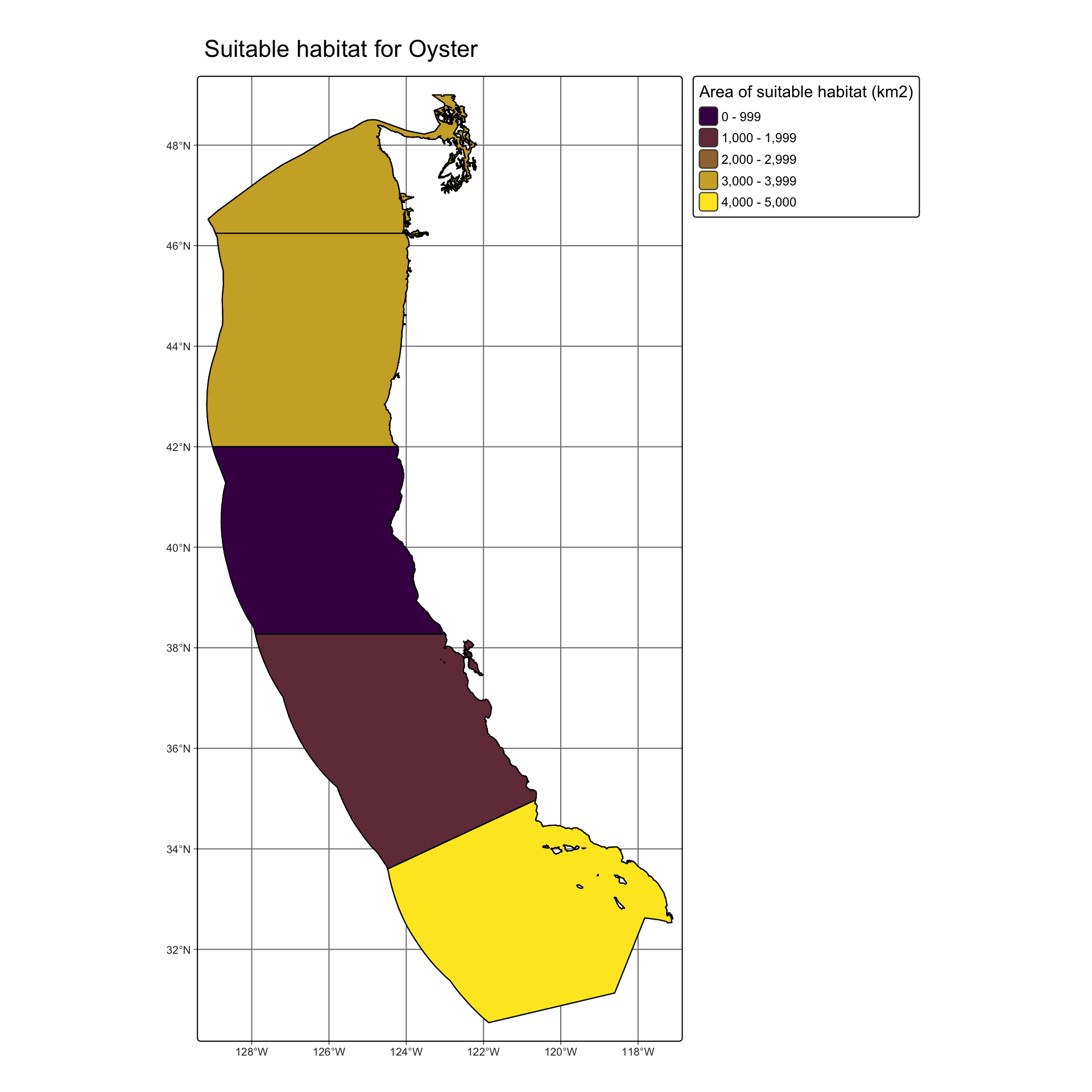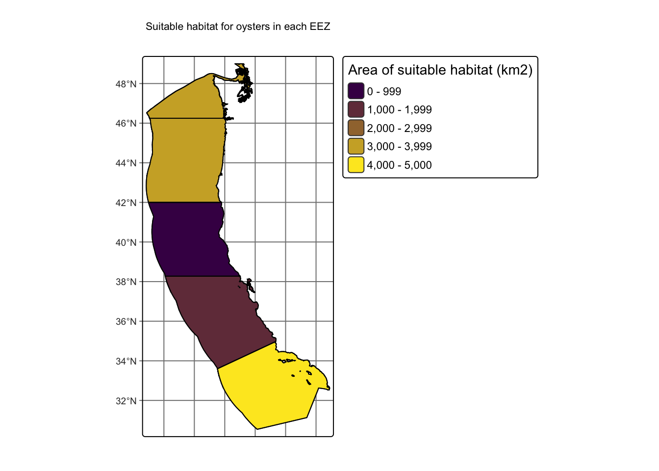 Now that we know which areas off the West Coast of the USA are habitable for our species of interest, here oysters, based on SST and depth, we can calculate how much area is habitable in each exclusive economic zone (EEZ), to allow for comparison across zones. This comparison can lead to management decisions about which zones are the best to explore marine aquaculture development for a specific species of interest.