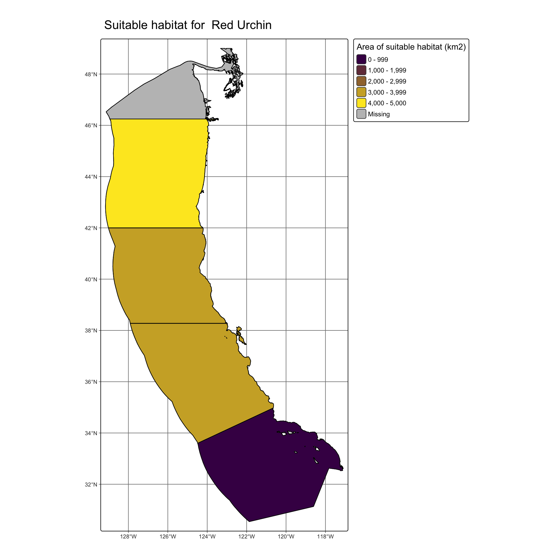 # set parms for the function for the red sea urchinmin_sst <-4.1max_sst <-10.7min_depth_m <-0max_depth_m <--125species_name <-" Red Urchin"# run my functionurchin_output <-suitable_habitat(bath = bath_final,eez = eez, # eez spatial dataframesst_c = sst_c, # raster of sea surface tempmin_sst = min_sst, # string with the minimum temp in Cmax_sst = max_sst, # string with the max temp in Cmin_depth_m = min_depth_m, # string with the minimum depth in mmax_depth_m = max_depth_m, # string with the maximum temp in mspecies_name = species_name) # string with species name)urchin_output